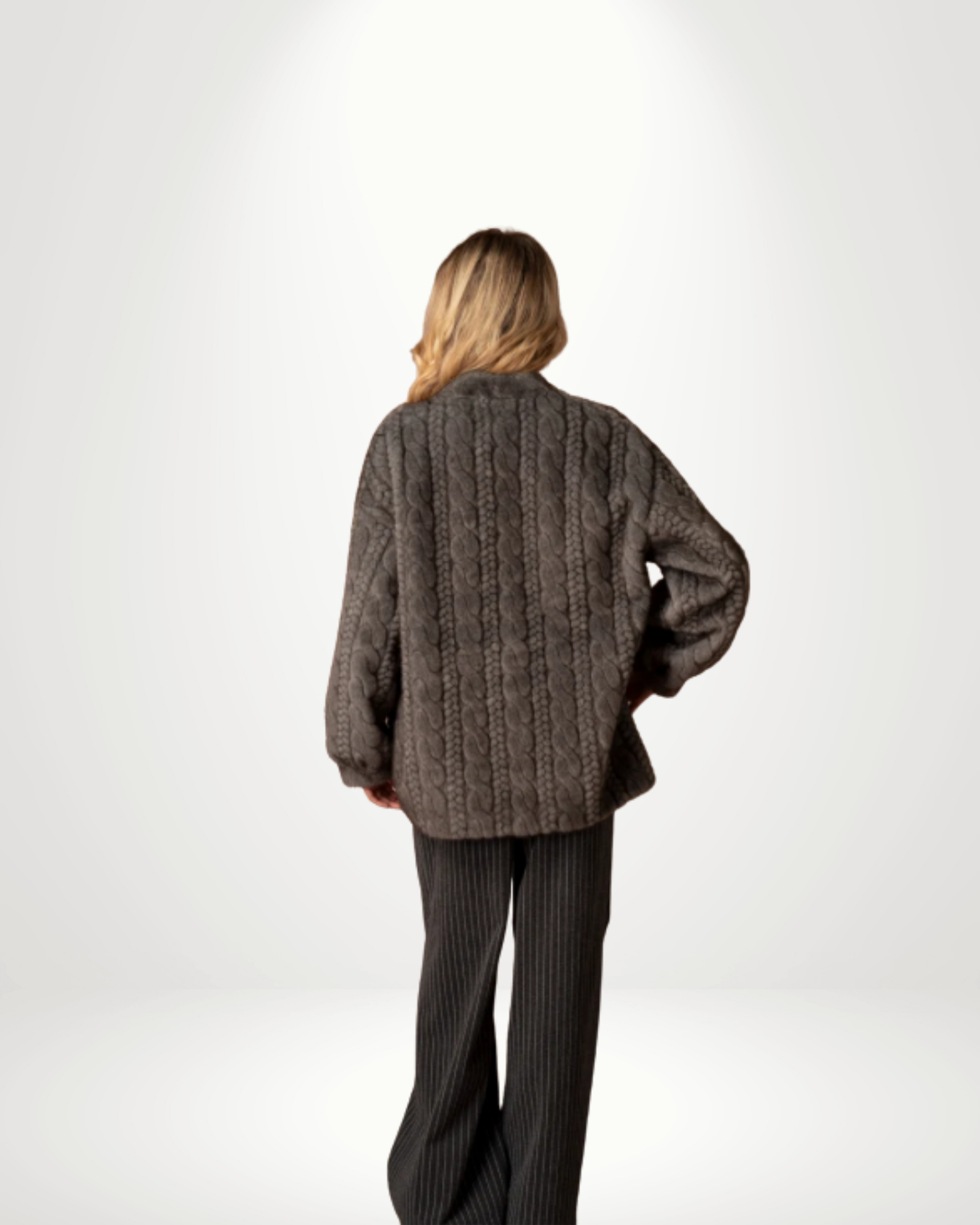 This Faux Fur Vest is crafted from soft, plush fur fur with a subtle cable-texture finish. Designed with a clean, relaxed silhouette, it drapes effortlessly and offers a slightly oversized look. Falls at hip length for easy layering.