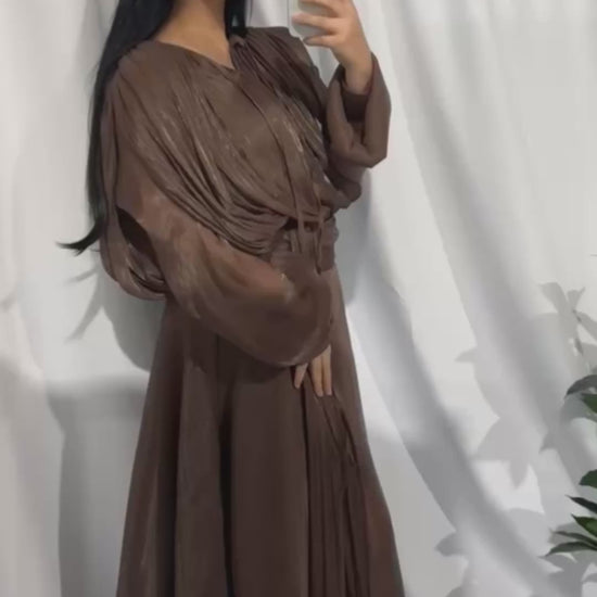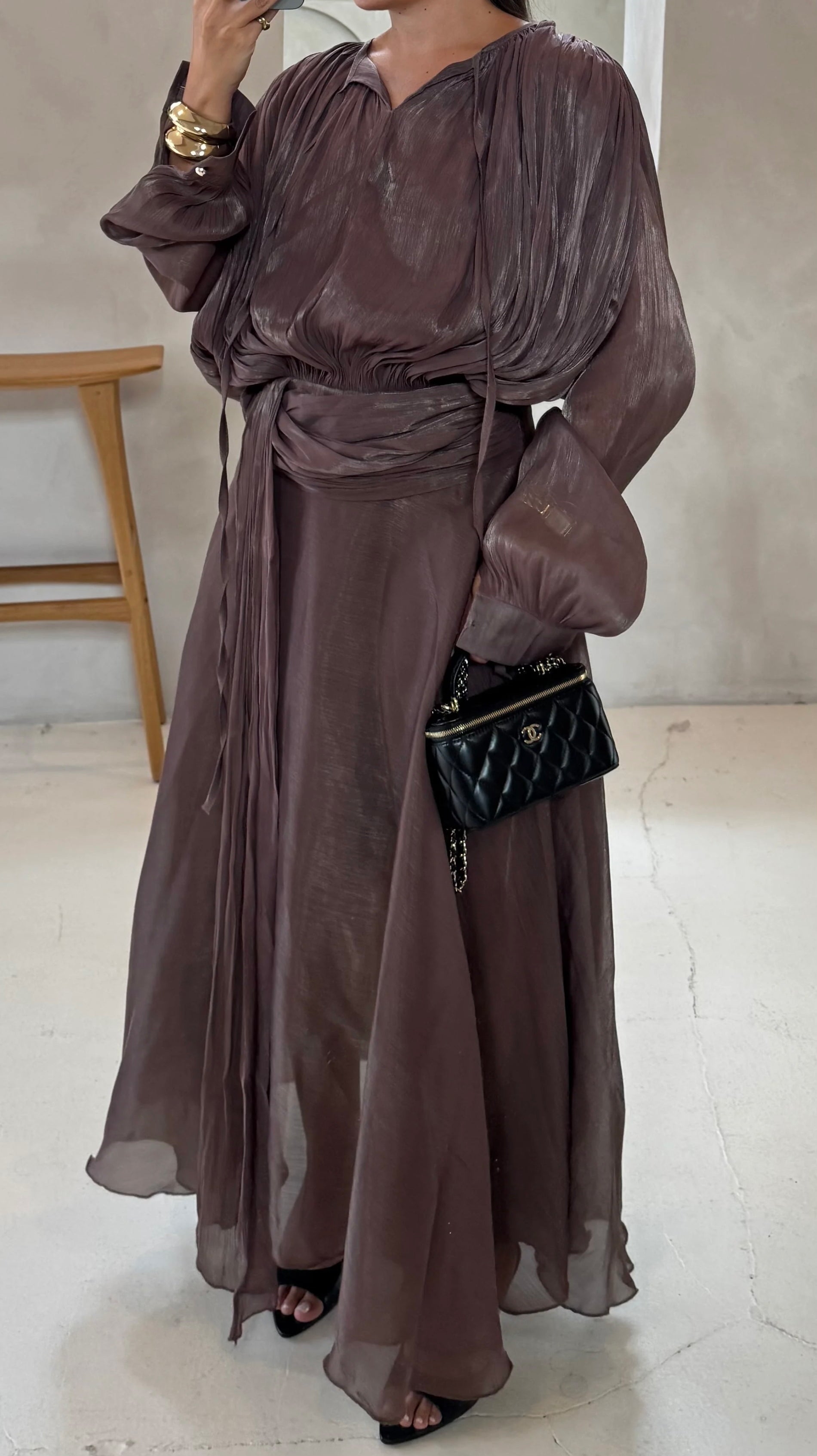 A fluid, shimmering silhouette crafted from delicate pleated fabric. The soft drape, subtle sheen, and refined tie detail create an effortlessly elegant and feminine look.